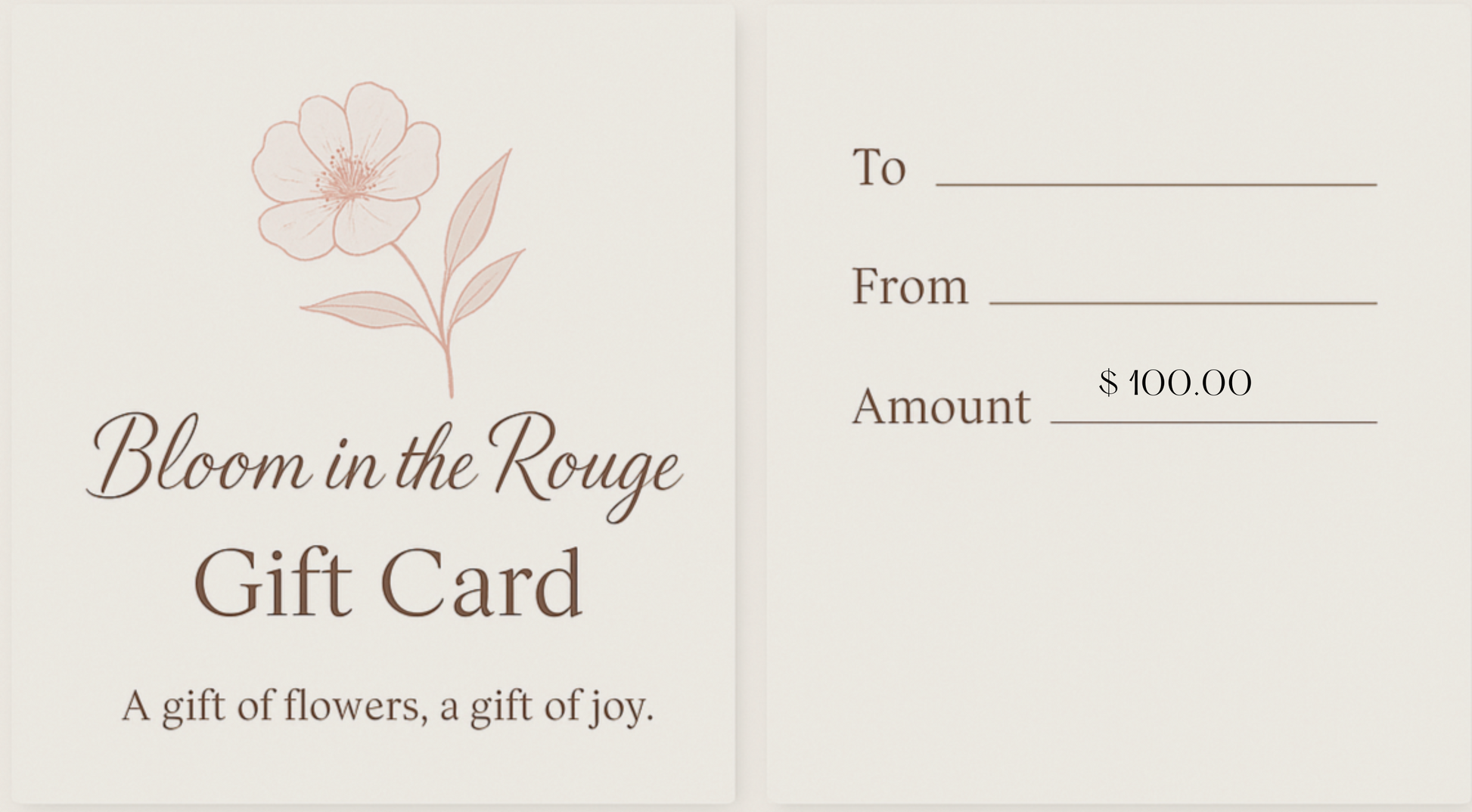 Share the joy of fresh, handcrafted floral arrangements with our $100 gift card. Perfect for covering custom orders or multiple arrangements, this gift card allows your loved ones to choose from our full selection of hand tied bouquets, vase arrangements, custom orders, and seasonal centerpieces.