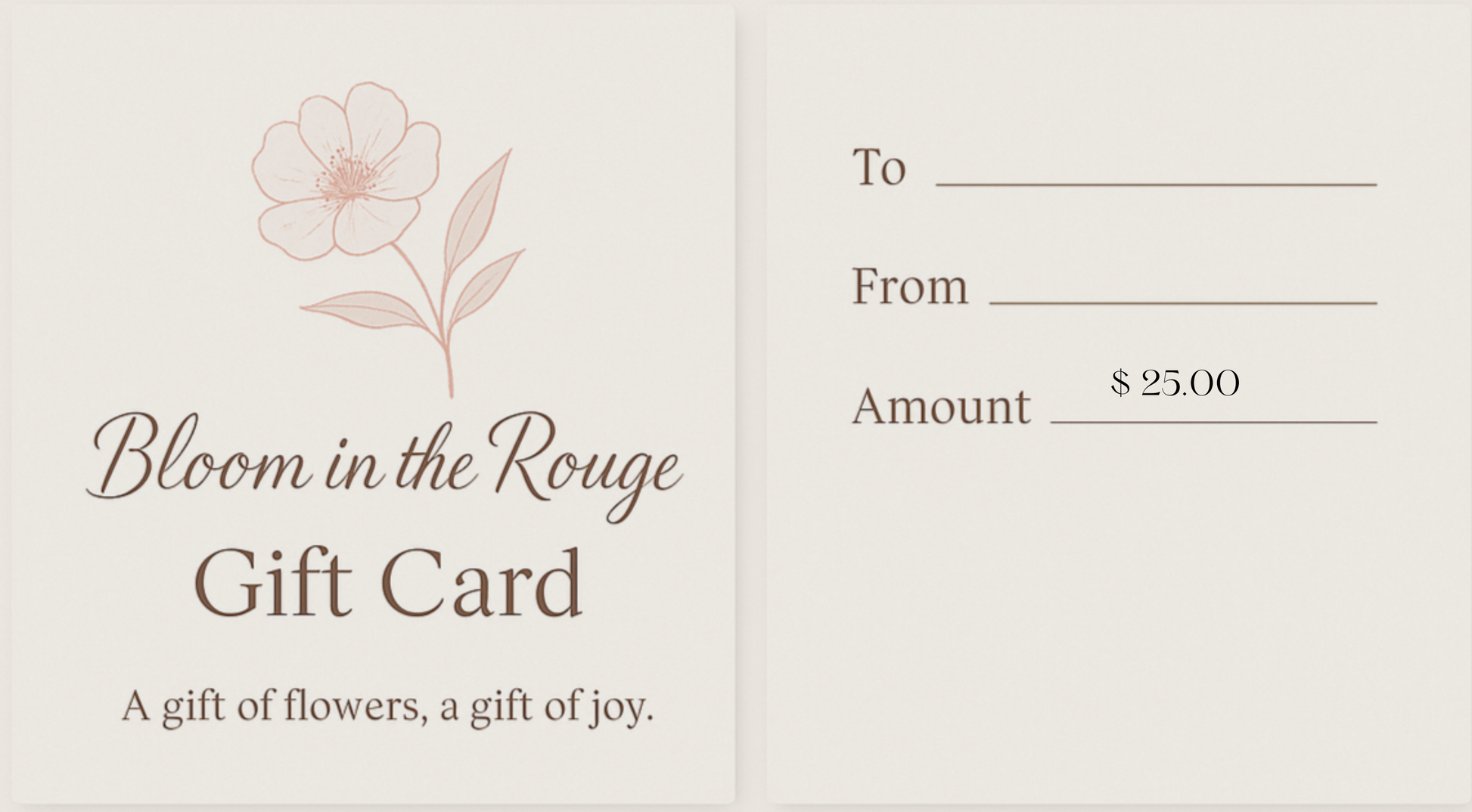 Share the joy of fresh, handcrafted floral arrangements with our $25 gift card. Perfect for smaller gifts or contributing toward larger arrangements, this gift card allows your loved ones to choose from our full selection of hand tied bouquets, vase arrangements, custom orders, and seasonal centerpieces.